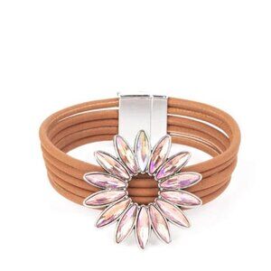 Row after row of brown suede cords layer around the wrist. Featuring oblong marquise style cuts, a collection of orange and iridescent rhinestones fans out into a circular focal point, resulting in a celestial centerpiece. Features a magnetic closure. Due to its prismatic palette, color may vary.
