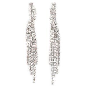 Encased in sleek silver fittings, dainty strands of glittery white rhinestones delicately overlap into a tapered tassel for a twinkly look. Earring attaches to a standard post fitting.