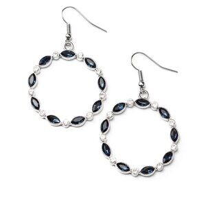 Encased in sleek silver frames, dainty white rhinestones and blue marquise gems delicately connect into a glittery hoop for a glamorous finish. Earring attaches to a standard fishhook fitting.