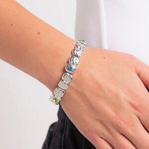 Infused along elastic stretchy bands, a collection of rounded, hammered silver squares is dotted with multicolored, opalescent, and iridescent rhinestones, creating a twinkly, textured look. Due to its prismatic palette, color may vary.