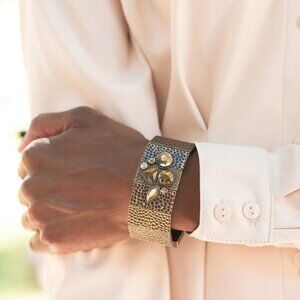 Hammered in gritty shimmer, rustic, rectangular, brass frames are threaded along stretchy bands that wrap around the wrist. Mismatched topaz, iridescent, and aurum rhinestones cluster on the front and back of the piece, creating dueling centerpieces. Due to its prismatic palette, color may vary.