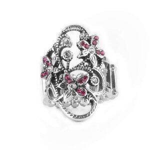 Sparkly fuchsia and white rhinestones are sprinkled across swirls of textured silver filigree and flowers, creating a glittery garden scene atop the finger. Features a stretchy band for a flexible fit.
