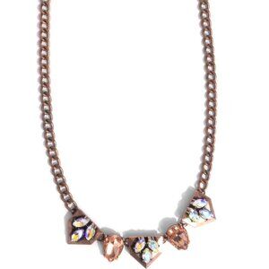 Featuring a chunky copper curb chain, a trio of geometric pendants and oversized peach gem teardrops rest below the neckline. Each copper triangle showcases clusters of marquise-cut iridescent rhinestones that create a striking contrast against the metal. Features an adjustable clasp closure.