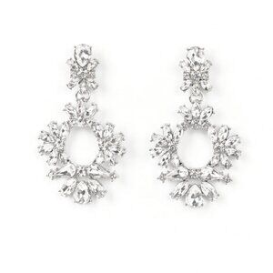 Ablaze with a mismatched assortment of brilliant white rhinestones, a stunning wreath swings from the bottom of a dainty white rhinestone fitting for a jaw-dropping dazzle. Earring attaches to a standard post fitting.