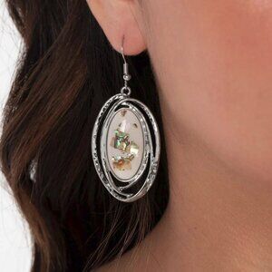 Flecks of iridescent shell shimmer against a background of white, creating an oblong oval centerpiece. Ripples of textured silver radiate from the shimmery focal point, encasing the design in asymmetrical frames. Earring attaches to a standard fishhook fitting.
