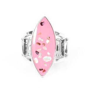 Iridescent shell-like flecks are sprinkled across a pink backdrop inside a glassy marquise shaped frame, resulting in a playful splash of color atop layered silver bands. Features a stretchy band for a flexible fit.