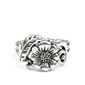 Brushed in an antiqued shimmer, a leafy silver frame and blooming floral centerpiece delicately join into a whimsical band around the finger. Features a dainty stretchy band for a flexible fit.