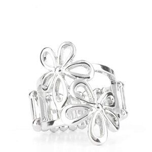 A pair of silver flowers bloom atop two silver bands, creating a simply seasonal centerpiece atop the finger. Features a stretchy band for a flexible fit.