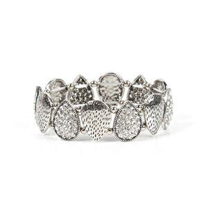 Infused with pairs of silver beads, a decorative collection of hammered silver teardrops, and white encrusted silver teardrops alternate along stretchy bands around the wrist for an edgy flair.