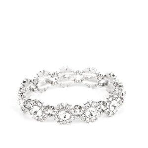 Separated by pairs of dainty silver beads, rhinestone-dotted petals bloom from oversized white rhinestone centers along stretchy bands around the wrist for a flirtatious floral fashion.