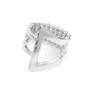 Featuring a high sheen finish, flared silver bars create a bold asymmetrical triangle atop the finger. Two small silver bars wrap around the side for an edgy modern finish. Features a stretchy band for a flexible fit.