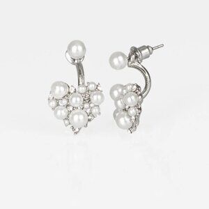 A solitaire white pearl attaches to a double-sided post, designed to fasten behind the ear. Radiating with dainty white rhinestones and matching pearls, the heart-shaped double sided-post peeks out beneath the ear for a refined look. Earring attaches to a standard post fitting.