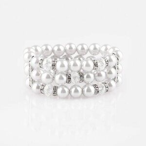 Pinched between white rhinestone encrusted frames, white rhinestone encrusted rings, crystal-beads, and silver pearls are threaded along elastic stretchy bands for a glamorous look.
