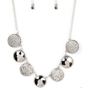 A gritty collection of hammered silver frames, oversized hematite rhinestones, and silver foiled-like frames delicately links below the collar, creating a sassy display of shimmer. Features an adjustable clasp closure.