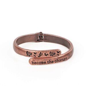 Antiqued copper bars curve and overlap around the wrist, creating a stacked design. One copper bar is stamped with the phrase, "become the change," while the other features engraved butterfly silhouettes in an inspiring finish. Features a hinged closure.