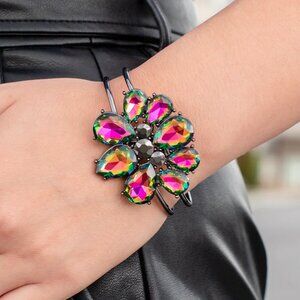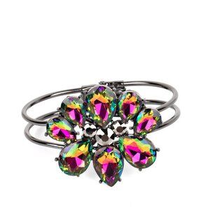 A dazzling collection of oil spill teardrop gems dramatically fan out around three round pieces of hematite, creating an explosion of sparkle. The exaggerated gems circle into a floral centerpiece that sits atop a pair of skinny gunmetal bars that wrap around the wrist in an airy finish. Features a hinged closure.