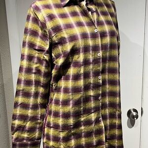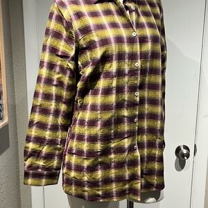 Plaid blouse with intricate embroidery. Velvet back with floral and dragon design. Unique and stylish.