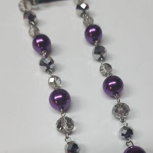 This stunning necklace features a beautiful arrangement of deep purple and silver beads, showcasing a pattern of alternating large purple beads and smaller silver or crystal beads. The smooth, polished finish of the purple beads contrasts elegantly with the reflective surface of the silver beads, creating a striking visual appeal. Perfect for adding a touch of sophistication to any outfit.