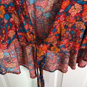 Paparazzi Red and Blue Tie Front Blouse with 3/4 Sleeves, lFlowy & Lightweight