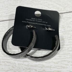 Glitz up any look with these Paparazzi silver toned, clear rhinestone half hoop earrings! Baguette and round cut rhinestones line the front of the hoops and a hammered metal look adorns the back. NWT