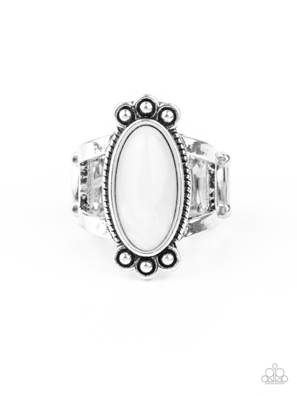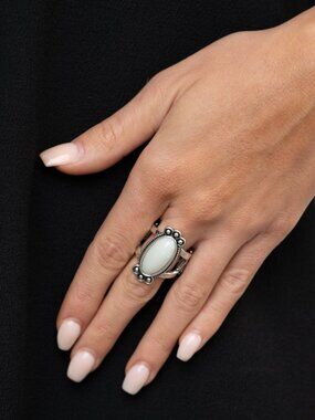 This Ring is perfect for any occasion. Elongated oval white stone. Textured silver frame. Stretchy band. Ring size fits 6 to 10.