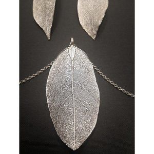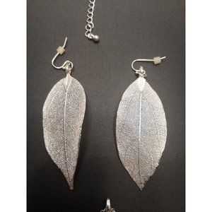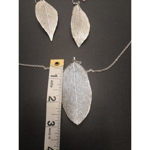 Paparazzi Silver Leaf Necklace And Earrings Set. In perfect condition! Necklace chain is 16 inches long. Leaf on necklace is 3 inches long. Leaves on earrings are 2.5 inches long. Perfect gift for the outdoor enthusiast! Great for Mother's day!