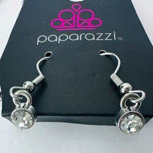 Gorgeous Paparazzi statement necklace featuring five large teal faux-gem stones framed in silver with delicate rhinestone accents. Includes matching crystal drop earrings. A bold, elegant piece perfect for dressy outfits, special events, or adding color to everyday looks.