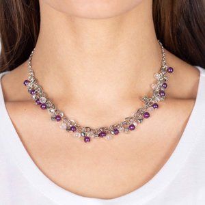 A dainty collection of purple pearls, white crystal-like accents, and silver heart beads delicately clusters along a dainty silver chain, creating a flirtatious fringe below the collar. Features an adjustable clasp closure.