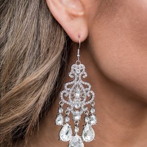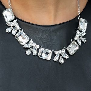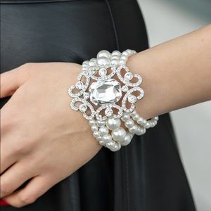 An oversized collection of white emerald cut gems and regally cut clusters of rhinestones and pearls