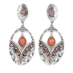Rippling with hammered silver textures, a brown stone dotted frame swings from the bottom of an ornate oval frame dotted with a matching brown stone. A smooth brown stone swings from the top of the ornate frame, creating an earthy lure. Earring attaches to a standard post fitting.