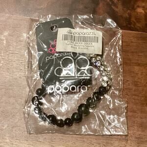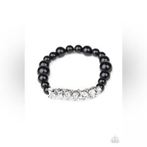 A collection of black beads and white rhinestone dotted silver frames are threaded along a stretchy band around the wrist, creating a sparkling centerpiece.