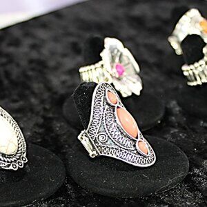 This is a set of five brand-new Paparazzi Fashion Rings, each featuring the signature comfortable stretch band that fits most sizes. These rings showcase bold stones, antique-silver detailing, and statement designs perfect for everyday wear or adding flair to any outfit. All are unused, displayed only for photos.