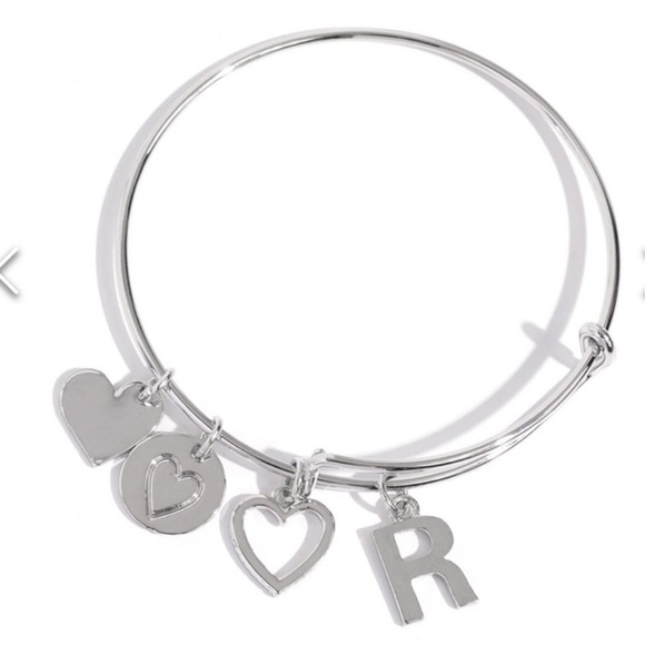 Featuring shiny silver, airy, and stamped finishes, a mismatched collection of dainty heart charms, and the letter "R" glides along a silver bar fitting at the center of the wrist for a romantic, sentimental flair.