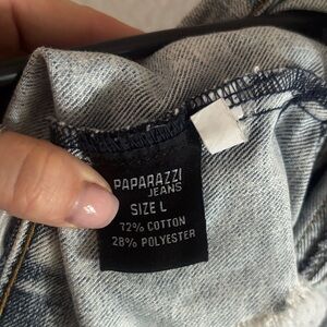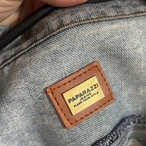 Stylish distressed denim jacket with frayed edges. Features a light blue wash and gold button accents.