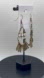 A row of delicately hammered brass rods fans out along a dainty brass wire that attaches to the bottom of stacked rows of opalescent white beads. The mismatched rows of dewy beads swing from the bottom of dainty brass chains, coalescing into an ethereally rustic chandelier. Earring attaches to a standard fishhook fitting.