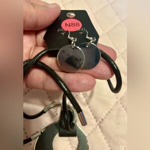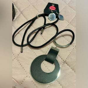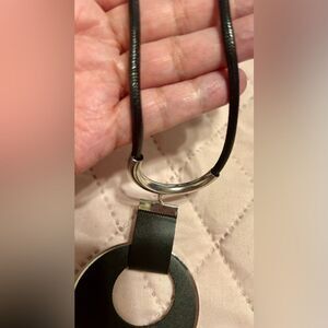 Large cut out silver disc overlaid with black leather, cradled in a wide black leather strap. The Luxe pendant swings from a u-shaped silver cylinder