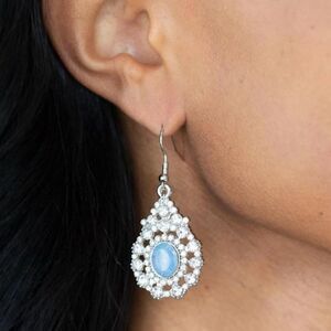 Celestial Charmer Blue Earrings. Bordered in a ring of dainty white rhinestones, an opalescent blue gem adorns the center of a teardrop frame radiating with glassy white rhinestones for an ethereally elegant look. The earrings are attached to a standard fishook fitting.
