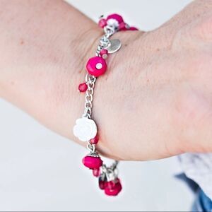 Tinted in the vivacious hue of Love Potion, faceted pink beads swing from the wrist in a flirtatious fashion. Infused with dainty crystal-like accents and shiny silver discs, white resin roses trickle between the colorful beading for a feminine finish. Features an adjustable clasp closure.