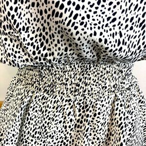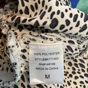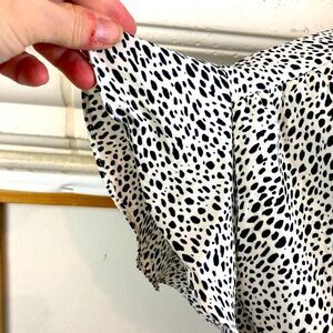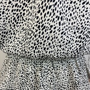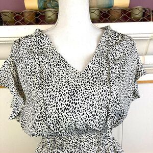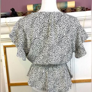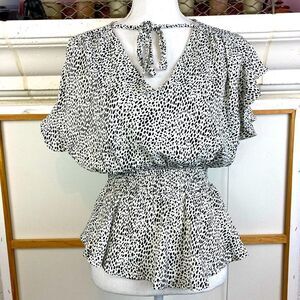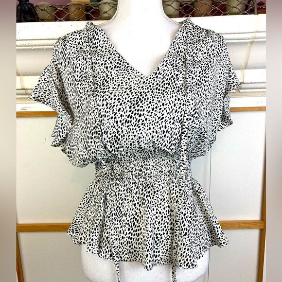 Elevate your wardrobe with this Papaya blouse, featuring a chic black and white pattern. The flutter sleeves and ruffled peplum design add a touch of elegance, while the tie front offers a customizable fit. Perfect for both casual and formal occasions, this top combines style and comfort effortlessly. NWOT no flaws. Pit to pit 19” waist before wide stretchy custom fit flatters waist 13”. Shoulder to hem 23”.