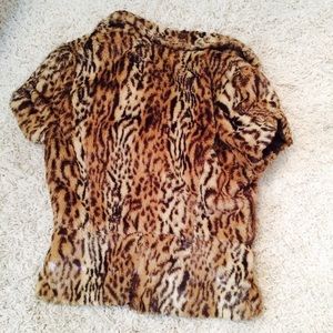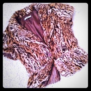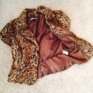 Cropped short sleeve faux fur leopard print single button jacket. Peplum style hem. Has belt loops for your belt of choice, Belt Not Included. Size small. 100% acrylic. No rips, tears or stains. Makes an awesome layered Fall piece ๐