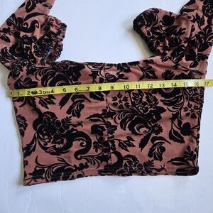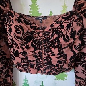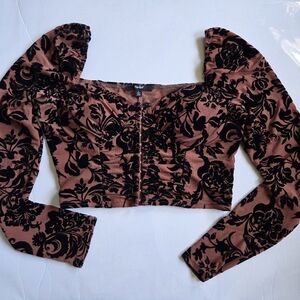 long-sleeved crop top with a square neckline and ruched detailing, featuring a black velvet floral pattern on top of a rust/brown-colored background with a pink undertone.