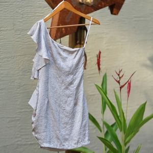 A brand new tag still on off right shoulder mini dress with ruffles on left shoulder and side material naturally textured never worn selling from our photo studio wardrobe closet.