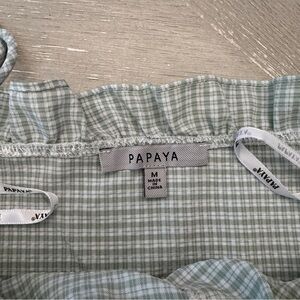 Chic gingham pattern. Lace-up front. Ruffled hem. Perfect for casual outings.