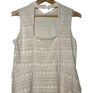 This sleeveless crochet dress combines comfort and style, offering a flattering fit-and-flare silhouette with a soft ivory hue. Ideal for chic everyday wear. Papaya brand dress in size Large. The dress is sleeveless, has a high neckline, and features a fit-and-flare silhouette. It is made of a white lace fabric with a repeating pattern of geometric shapes and floral motifs.