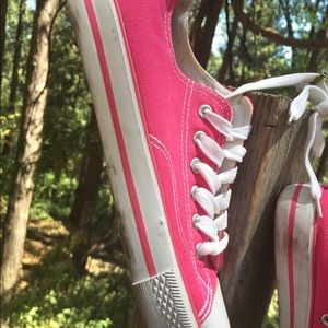 Classic converse style low top sneakers by Papaya. Cotton uppers , rubber soles . Bright fuchsia pink with white stitching , with white rubber rims with pink accent . Get you casual on with these fine foot wear .a reposh KristenFind posh on girlfriend. Just for you by Papaya.