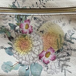 White bag features a delicate floral pattern. Black bag has a gold metallic floral covering. Both have interior and exterior pockets featuring gold hardware.