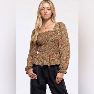 Floral Blouse Smocked Stretch Criss Cross Back Ruffles Preppy Feminine
