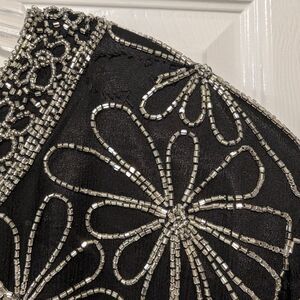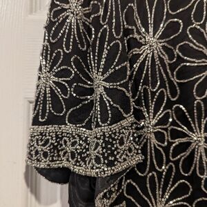 Papell Boutique Evening 100% Silk Black Fully Beaded Floral embroidered Short Sleeve back zipper shirt Blouse top size Large. Formal, special occasions, wedding. Missing few beads on a shoulders. See pictures.
