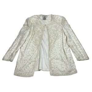 Papell Boutique Evening Vintage 90s Off White Lace Beaded Sheath Dress w Long Line Jacket Set - Size 12