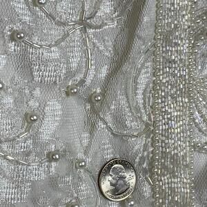 Floral lace overlay coverd with pearl and irradescent bugle beads. Flowers are a sylistic mum. The dress and jacket are edged with a stripe of beading